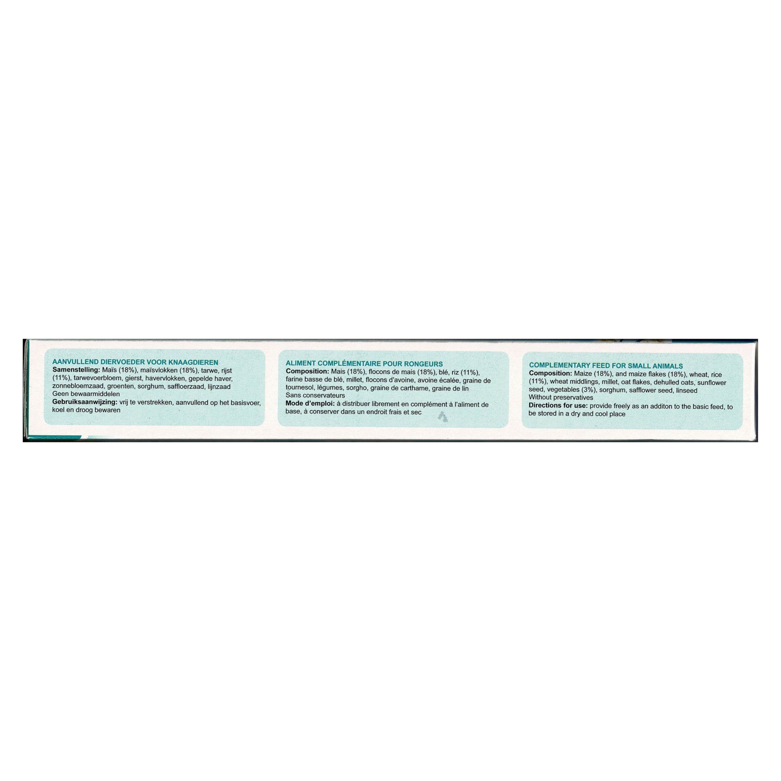 Snacks ideal para complementar la dieta de estas pequeñas mascotas, basadas a veces sólo en piensos. Ésta golosina resulta muy apetecible, nutritiva y saludable. Composicion: Maiz (18%) y copos de maiz (18%). trigo, arroz (11%), harinas de trigo, mijo, copos de avena, avena descacarillada, semillas de girasol, hortalizas (3%), sorgo, semillas de cartamo, semillas de lino. Sin Conservantes