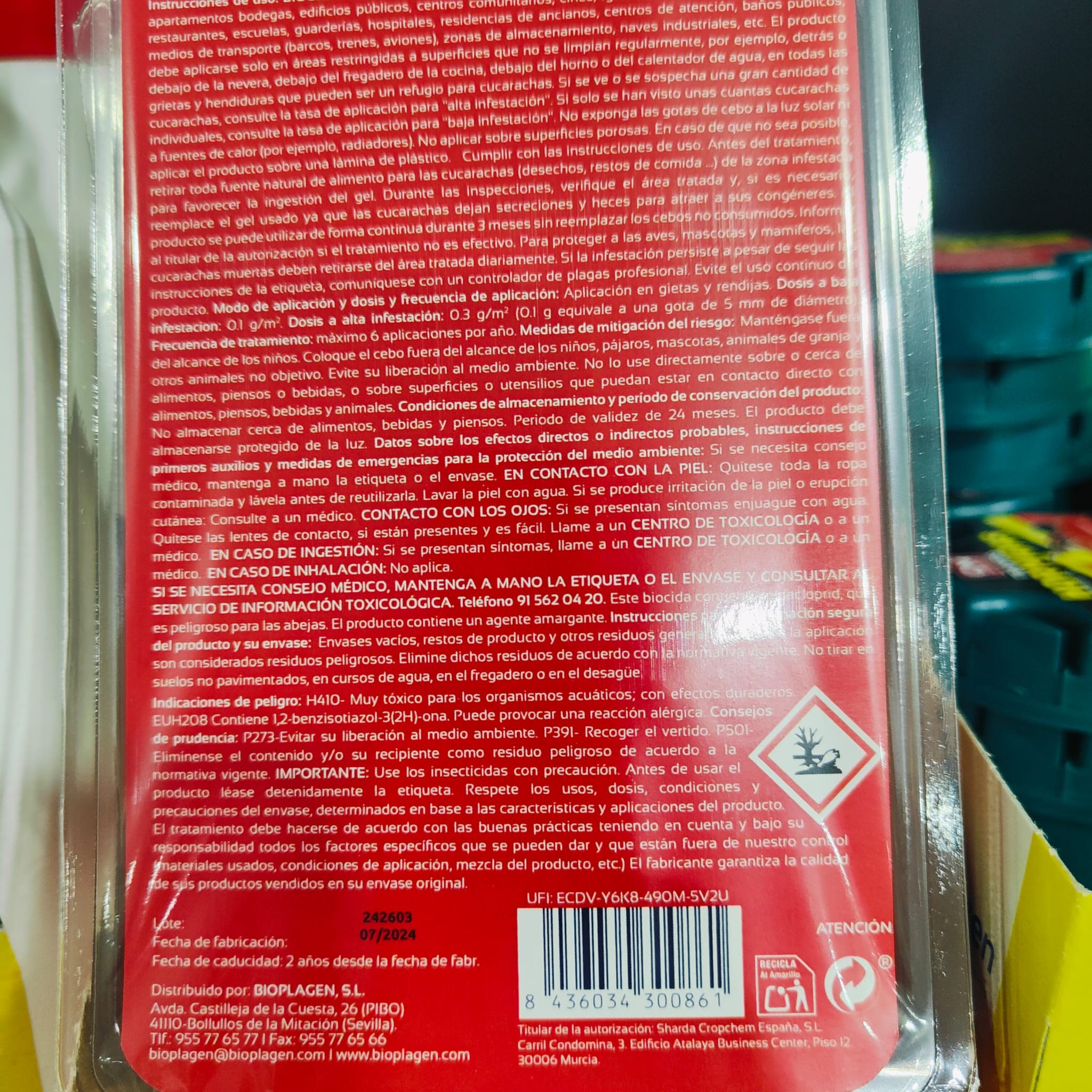 COMPOSICIÓN (Cebo en gel listo para su uso)Imidacloprid 2,15%· Insecticida en forma de gel-cebo, muy atrayente y altamente apetente para todo tipo de cucarachas: cucaracha negra (Blatta orientalis), cucaracha rubia (Blattella germanica), cucaracha americana (Periplaneta americana), cucaracha del café (Supella longipalpa).· Listo para usar, con un efecto duradero en el control de cucarachas (adultos y ninfas).· Al ingerir o contactar con el gel, lo trasladan al nido, donde contaminarán al resto.· Contiene imidacloprid, insecticida que actúa por ingestión y contacto contra los insectos.Nivel de Infestación normal (cuando el número de insectos detectados es reducido):- Cucaracha rubia. (Ninfas y adultos): 1 gota/ m2- Cucaracha negra (Ninfas, adultos): 2 gota/ m2Nivel de Infestación alto (cuando se detecte un gran número de insectos):- Cucaracha rubia. (Ninfas y adultos): 2 gota/ m2- Cucaracha negra (Ninfas, adultos): 3 gota/ m2Nota: 1 gota de gel de aprox. 5 mm de diámetro es 0,1 g.10 gAplicación localizada en grietas y rendijas en las zonas de tránsito de los insectos. Aplicar en los lugares favorables a la proliferación de cucarachas: lugares cálidos, húmedos, oscuros como rincones, grietas, a lo largo de zócalos, detrás de muebles y aparatos de cocina, cañerías, etc. Puede emplearse tanto en interiores (cocinas, despensas, almacenes, etc) como en exteriores (patios, terrazas, balcones, etc) en aquellos sitios donde proliferen o por donde se desplacen las cucarachas. No aplicar sobre maderas ni superficies porosas. No mezclar con otros productos químicos. No aplicar en las zonas visibles ni accesibles.VENTAJAS· Altamente apetente· Para todo tipo de cucarachas· Efecto duradero en adultos y ninfasAprobado para su uso por el Público en General