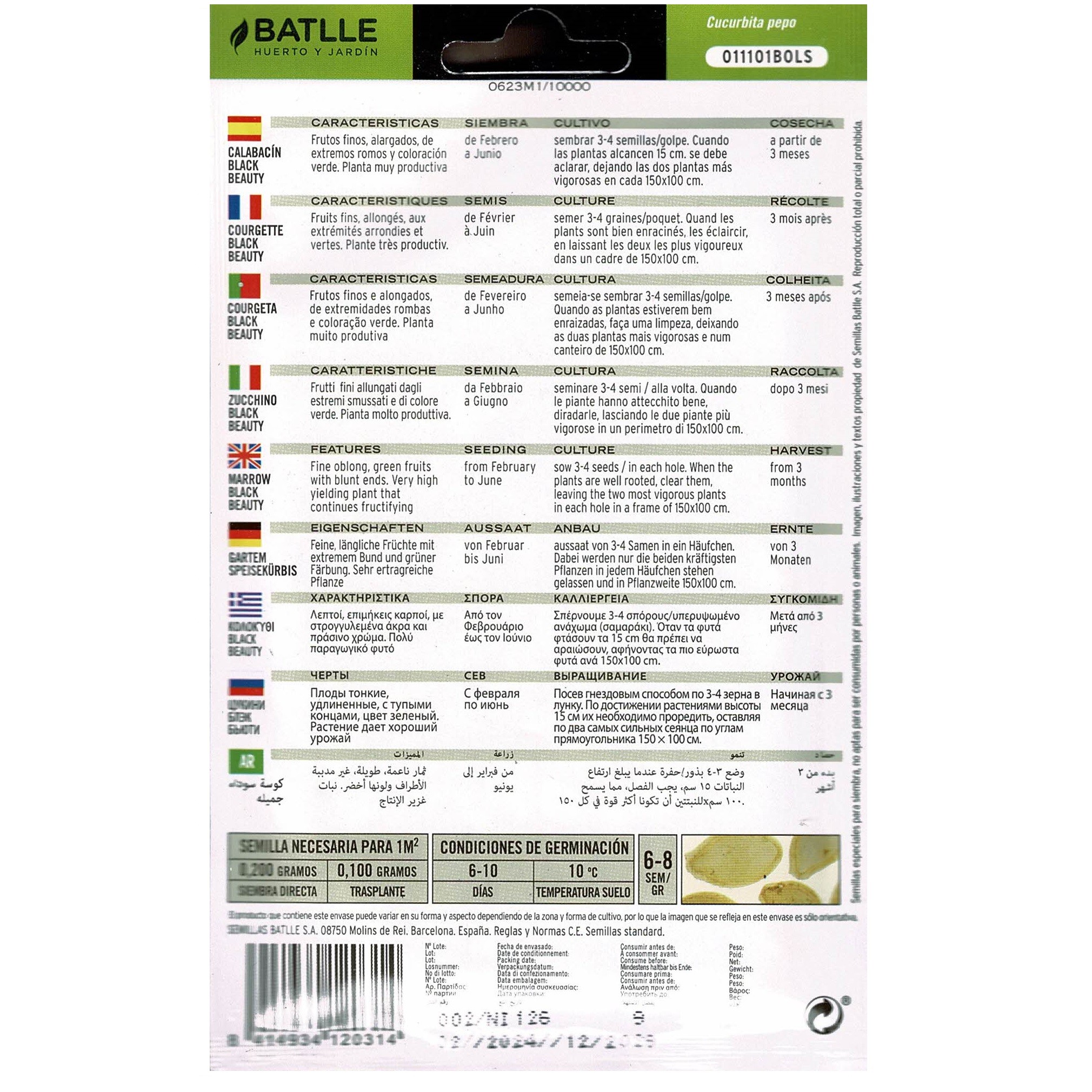 El Calabacín (Cucurbita pepo) es una hortaliza muy apreciada y de fácil cultivo de la familia de las Cucurbitáceas. Produce unos frutos de diferentes colores normalmente blancos grisáceos o verdes y diferentes formas (cilíndricos, mazudos, redondos). Se aprovechan los frutos inmaduros. Es una verdura de fácil digestión y de propiedades refrescantes y rica en vitamina A.CONSEJOS GENERALES PARA EL CULTIVO DEL CALABACINPrefiere los terrenos sueltos, profundos y frescosLa multiplicación es por semilla y la siembra puede hacerse directamente en el terreno o en semilleros para su trasplante. Se deben conseguir 1-2 plantas/m2. Para siembra directa 1-1,60 m entre caballones y 0,9-1 entre plantas sembrando 3 semillas/golpe. En bandejas 1-2 semillas por alveolo (según la germinación) y trasplantar cuando las plantas tengan 10cms. Aproximadamente (15-25 días).Para la germinación de las semillas, el suelo debe tener más de 18ºC. Desarrollo óptimo de crecimiento entre 25-30ºC. Normalmente tardan 40-50 días desde la siembra hasta el inicio de la recolección, aunque puede variar según las condiciones. El cero vegetativo es de 8ºC. Se considera una planta con menos requerimientos térmicos que el melón y el pepino.Es una planta muy exigente en iluminación.Necesita grandes cantidades de nutrientes aunque se debe cuidar no incorporar demasiado Nitrógeno antes de la floración.Durante el cultivo es muy importante que la planta siempre tenga bastante agua para su desarrollo.El calabacín tiene flores machos y hembras en la misma planta, pero se necesita la plantación cruzada para un desarrollo correcto de los frutos. Las abejas son muy importantes y necesarias para realizar este trabajo.La recolección se efectúa cuando los frutos no han alcanzado su desarrollo definitivo.En buenas condiciones de cultivo pueden obtenerse 30-50 Tm/Ha.Es una planta bastante rústica y sus principales enemigos son el Oidio y araña en épocas calurosas, Virosis y deformaciones de frutos debido a Botritis, Antracnosis, fallos de polinización y abonado excesivo.CALABACIN BLACK BEAUTYMata sin ramificaciones, muy precoz, frutos finos, alargados, de extremos romos y coloración verde. Planta sumamente productiva, que mientras se le van quitando calabacines, no cesa de fructificar. Carne sabrosa y delicada. Forma de cultivo: Se siembra de Febrero o Mayo de asiento, a golpes y marco de 150 x 100 cms. Rellenar los hoyos con mantillo, con una ligera capa de tierra encima en la que se depositaran de 5 a 6 semillas. Bien enraizadas las plantas aclarar, dejando solamente las dos más vigorosos en cada golpe. Recolección: Aproximadamente a los 4 meses de su siembra.