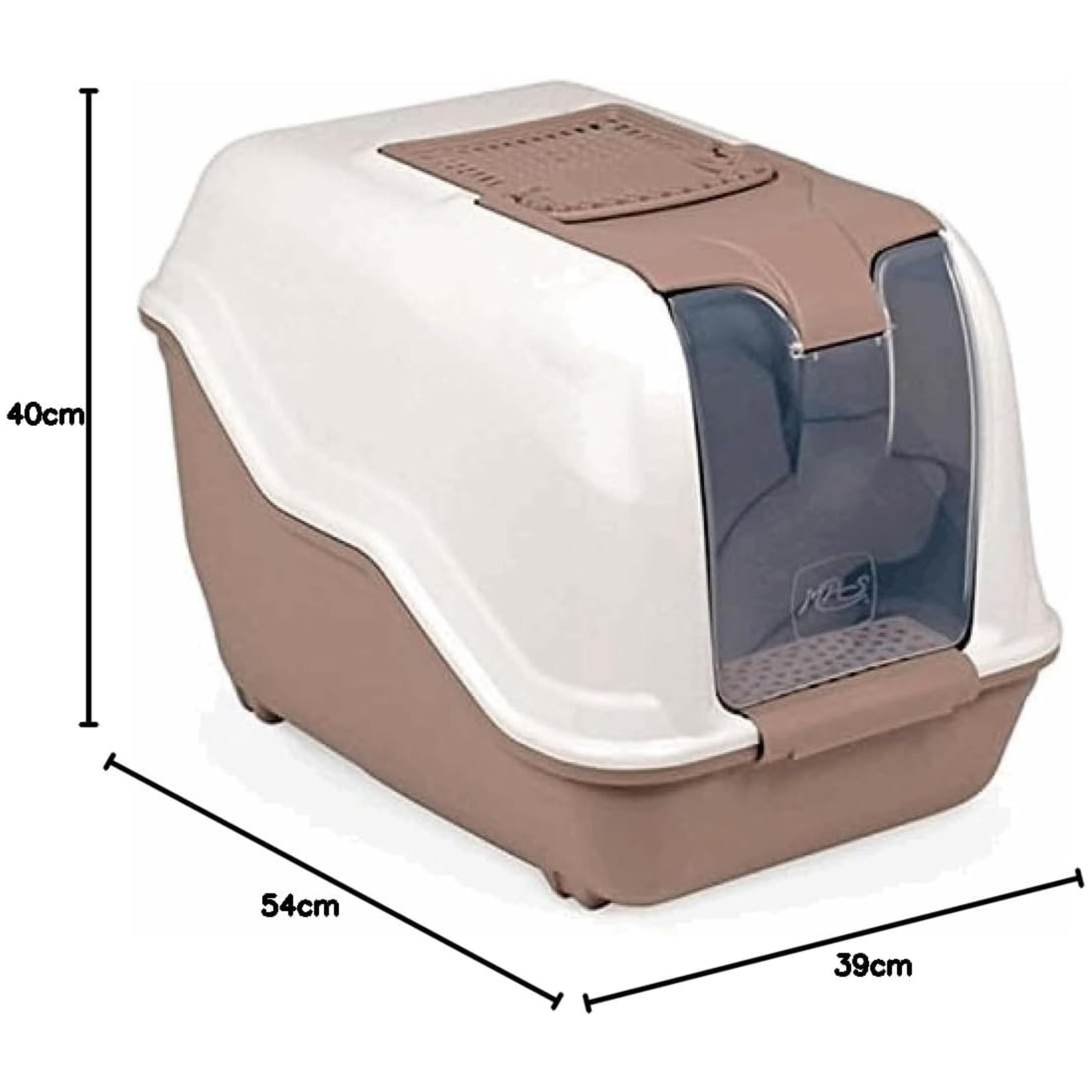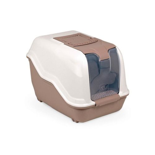 Caseta higiénica cerrada, para reducir la dispersión de los granos de arena y los malos olores. Fabricada con plástico de primera calidad, no tóxico y resistente a los rayos UV. Medida: 54 x 39 x 40 cm. Colores según disponibilidad.