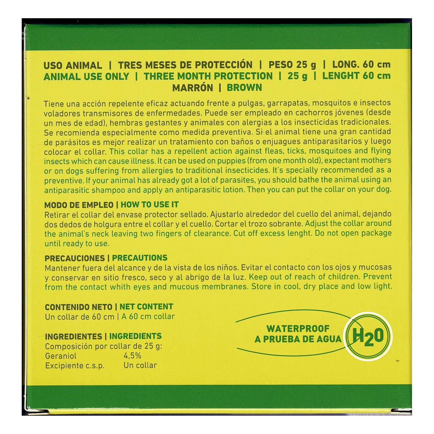 Repelente Natural de parásitos externos e insectos voladores100% Protección Natural, NO contiene insecticidas.Tiene una acción repelente eficaz actuando frente a pulgas, piojos, garrapatas, mosquitos e insectos voladores transmisores de enfermedades. Puede emplearse en cachorros o gatitos jóvenes (desde un mes de edad), hembras gestantes y animales con alergias a los insecticidas tradicionales. Si el animal tiene una gran cantidad de parásitos es mejor realizar antes un tratamiento con baños o enjuagues antiparasitarios y luego el collar.MODO DE EMPLEOAjustar el collar alrededor del cuello, dejando un par de dedos de holgura. Cortar el trozo sobrante. No abrir el envase que contiene el collar hasta el momento de usarlo.CARACTERÍSTICAS Y COMPOSICIÓNUso Animal3 Meses de protecciónPeso: 25 gr.Longitud: 60 cmColor: marrón* Aceite de Neem ——————— 2.0%* Aceite Esencial de Eucalipto —– 1.0%* Esencia de Citronela —————- 0.5%* Aceite de Mentol ———————- 0.5%* Excipiente C.S.P. un collarTodos los ingredientes poseen acción repelente de pulgas, piojos, garrapatas, mosquitos e insectos voladores. El Aceite de Neem procedente de los frutos y semillas del Árbol de Neem (Nim o Margosa), es uno de los insecticidas ecológicos más usados por su alto poder preventivo frente a éstas infestaciones.Aceite de Geraniol: Es un aceite esencial presente de forma natural en multitud de plantas como: Geranios, rosas, limón. Ha demostrado gran efectividad en repeler una gran cantidad de insectos.