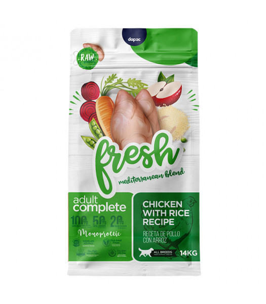 Pollo deshidratado. Pollo fresco 20%. Arroz entero 15%. Trigo. Maíz. Grasa de ave. Cebada. Hidrolizado de hígado de pollo. Guisantes 3%. Remolacha 2%. Levaduras (Fuente de MOS). Zanahoria 1%. Manzana 1%. Aceite de oliva. Achicoria
