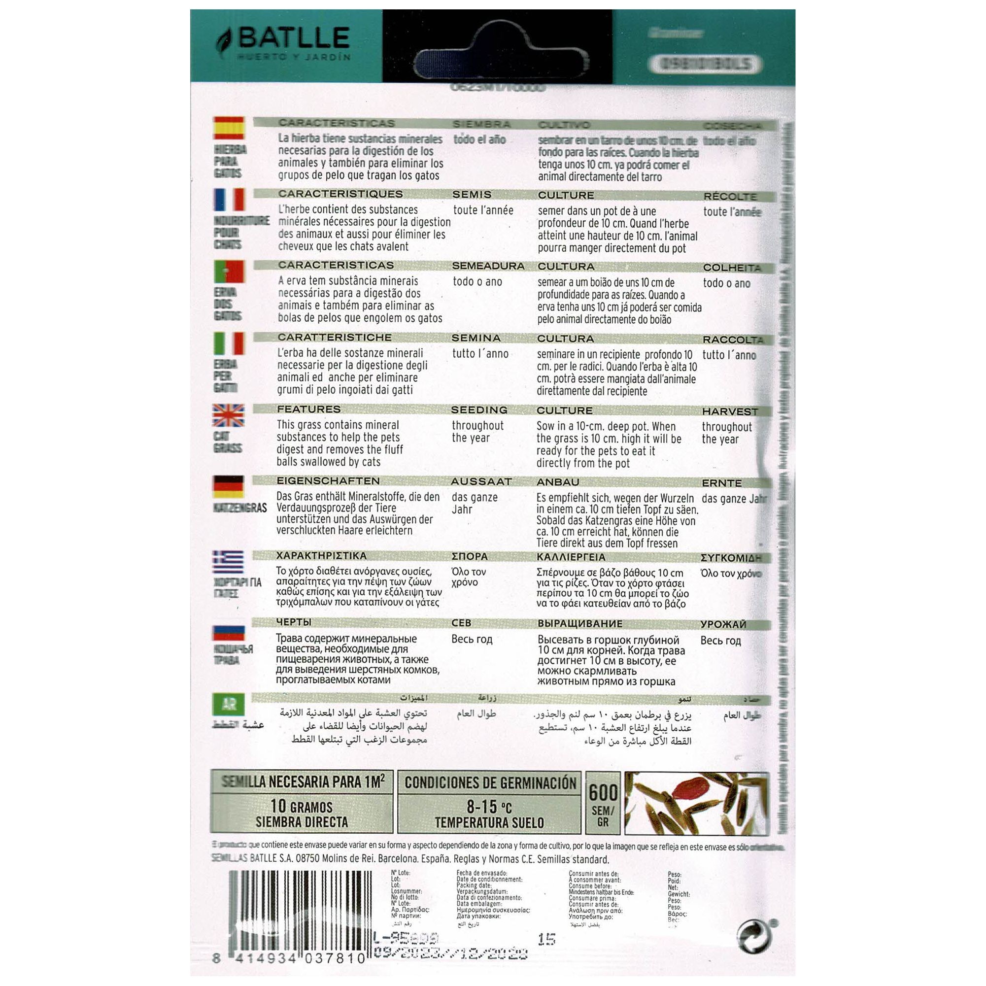 COMIDA PARA GATOS:Semilla para comida de gatos y perros pequeños. Siembra: Todo el año. Se recomienda sembrar en un tarro de unos 10 cms. de fondo para las raices. Cuando la hierba tenga unos 10 cms. ya podrá comer el animal directamente del tarro. La hierba tiene sustancias minerales necesarias para la digestión de los animales y también para eliminar los grupos de pelo que tragan los gatos.