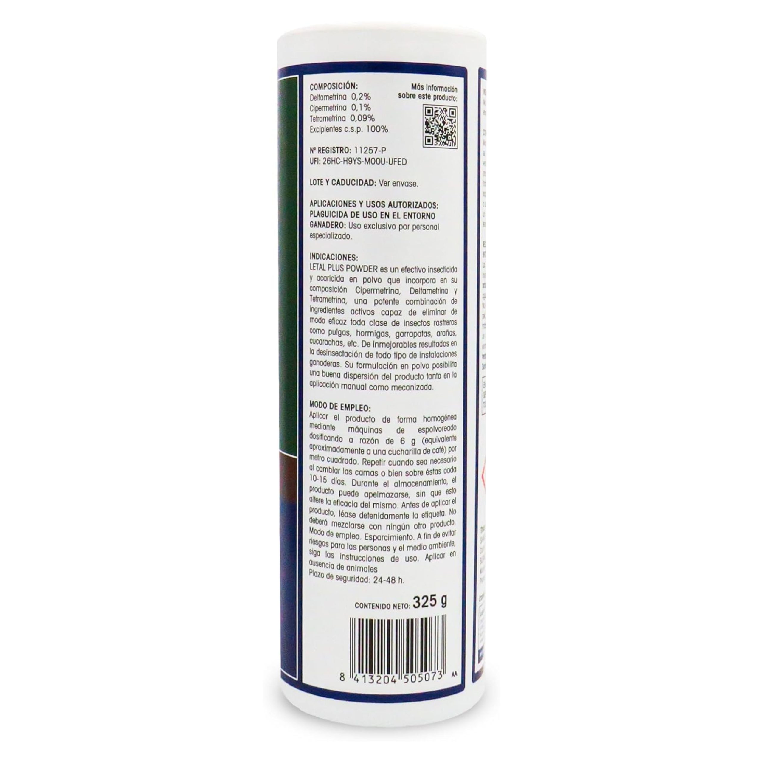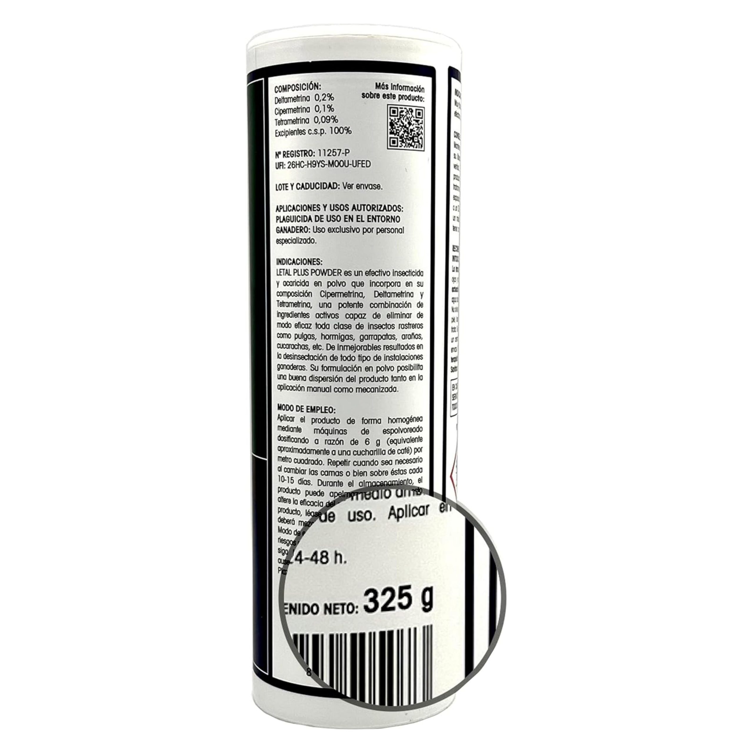 LETAL PLUS POWDER es un efectivo insecticida, acaricida en polvo que incorpora en su composición Cipermetrina, Deltametrina y Tetrametrina, potente combinación de ingredientes activos capaz de eliminar toda clase de insectos rastreros como pulgas, hormigas, garrapatas, arañas, cucarachas, etc. De inmejorables resultados en la desinsectación de todas las instalaciones ganaderas. Su formulación en polvo posibilita una buena dispersión del producto tanto en la aplicación manual como mecanizada.Modo de AplicaciónAplicar el producto de forma homogénea mediante máquinas de espolvoreado dosificando a razón de 6-12 g (equivalente a una/dos cucharillas de café) por metro cuadrado. Repetir cuando sea necesario, al cambiar las camas o sobre estas cada 10-15 días. Durante el almacenamiento, el producto puede apelmazarse, sin que esto altere la eficacia del mismo.Modo de empleo: Esparcimiento.Plazo de seguridad: 24-48 h.Información adicionalComposiciónExcipiente c.p.s.: 100%, Tetrametrina: 0,09%, Cipermetrina: 0,1%, Deltametrina: 0,2%FormatosTalquera 325 gr, Cubo 1 kg, Saco 5 kg, Saco 20 kgUso en entorno ganadero: nº reg11257-PMuy toxico para organismos acuaticos, con efectos duraderos. Mantener fuera del alcance de los niños. Evitar su liberacion al medio ambiente. Recoger el vertido. Eliminar el recipiente y los restos de productos conforme a la legislacion vigente de tratamiento de residuos. La intoxicacion puede producir irritacion de ojos y tracto respiratorio. En contacto con los ojos, lavar con abundante agua al menos 15 minutos. No olvide retirar las lentillas. En contacto con la piel lavar con abundante agua y jabon sin frotar. Si es necesario traslade al accidentado a un centro sanitario y lleve la etiqueta o el envase. En caso de accidente consultar al servicio medico de informacion toxicologica. Telefono 915620420