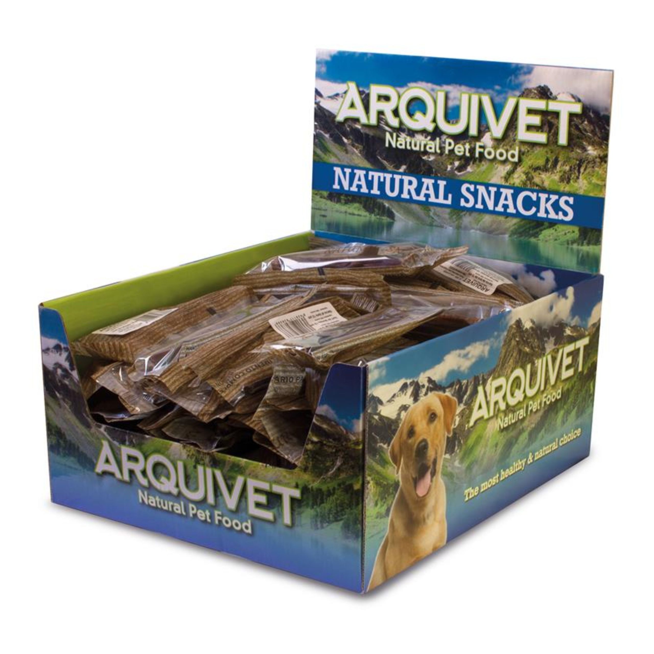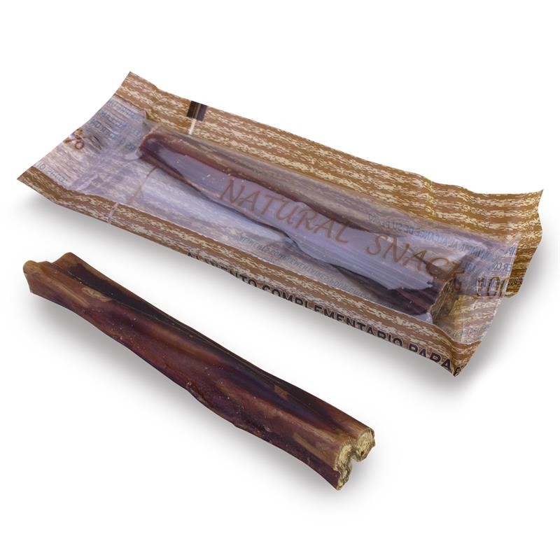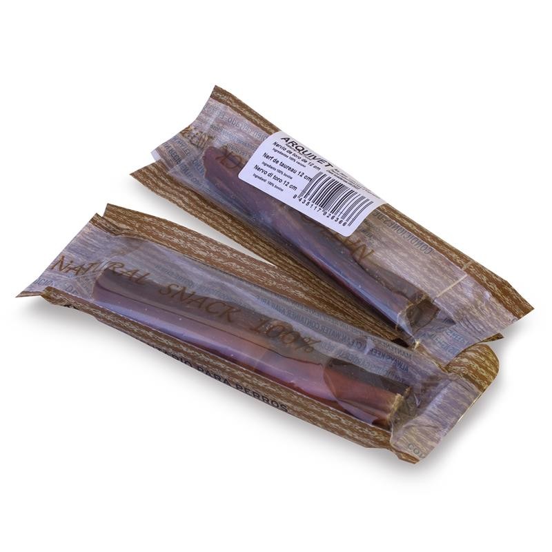 Caja expositora con 75 unidades (ensobradas) de nervio de toro. Este producto es completamente natural y proviene de tendones de vacuno deshidratados y ahumados. Sólo se venden cajas completas.Los nervios de toro ayudan a una completa limpieza dental a través de la eliminación del sarro acumulado, la prevención de la placa y el fortalecimiento de los músculos masticatorios. A los perros les encantan estas chucherias y además son muy nutritivas, siendo perfectas como recompensas durante el adiestramiento.El perro debe ser supervisado en todo momento mientras se alimenta. Mantener en lugar fresco y seco, así como no exponer directamente a la luz solar. Dejar siempre agua dulce y fresca a disposición de su mascota. Componentes analíticos: Proteina bruta 80%, Grasa 7,5%, Humedad 2,6%.Ingredientes: 100% nervio de toro.