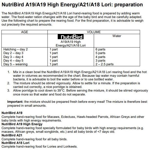 NutriBird A 19 es un alimento completo y equilibrado para la cría a mano de guacamayos, loros grises, loros eclectus, deroptyus accipitrinus y otras aves bebé con altas necesidades energéticas. Modo de empleo:La pasta NutriBird A 19 para la cría a mano se prepara añadiendo agua hervida. Las proporciones de la mezcla dependen de la edad del polluelo y deben cumplirse a rajatabla. Utilice la tabla adjunta para preparar la pasta. Es recomendable medir cuidadosamente las cantidades en las primeras preparaciones.Mezcle en un recipiente pequeño las cantidades recomendadas en la tabla de la pasta de cría NutriBird A 19 con agua caliente. Habida cuenta de las bacterias dañinas que puede contener el agua del grifo, es muy aconsejable hervir el agua antes o utilizar agua embotellada.Mezclar enérgicamente la pasta. Dejar reposar un minuto. Si se prepara adecuadamente, se acaba obteniendo una papilla espesa.Dejar enfriar la papilla resultante hasta 39°C. Antes de administrarla, remover de nuevo bien para evitar que se separen el agua y la pasta.Atención: la papilla tiene que estar recién preparada para cada comida. Así pues, conviene preparar el alimento en pequeñas cantidades.