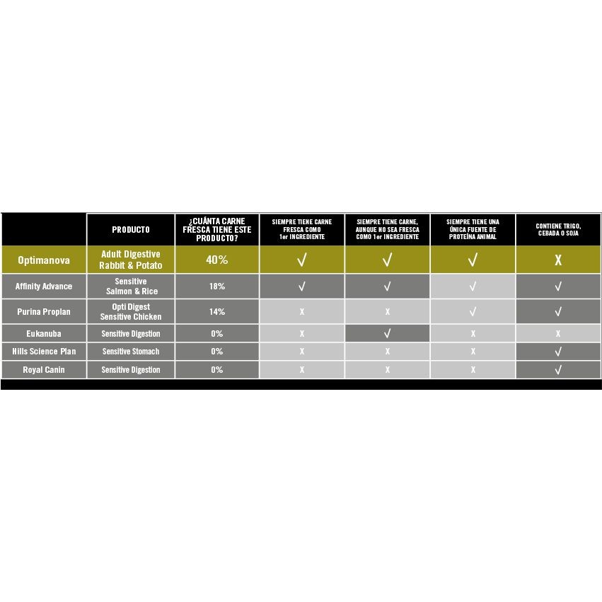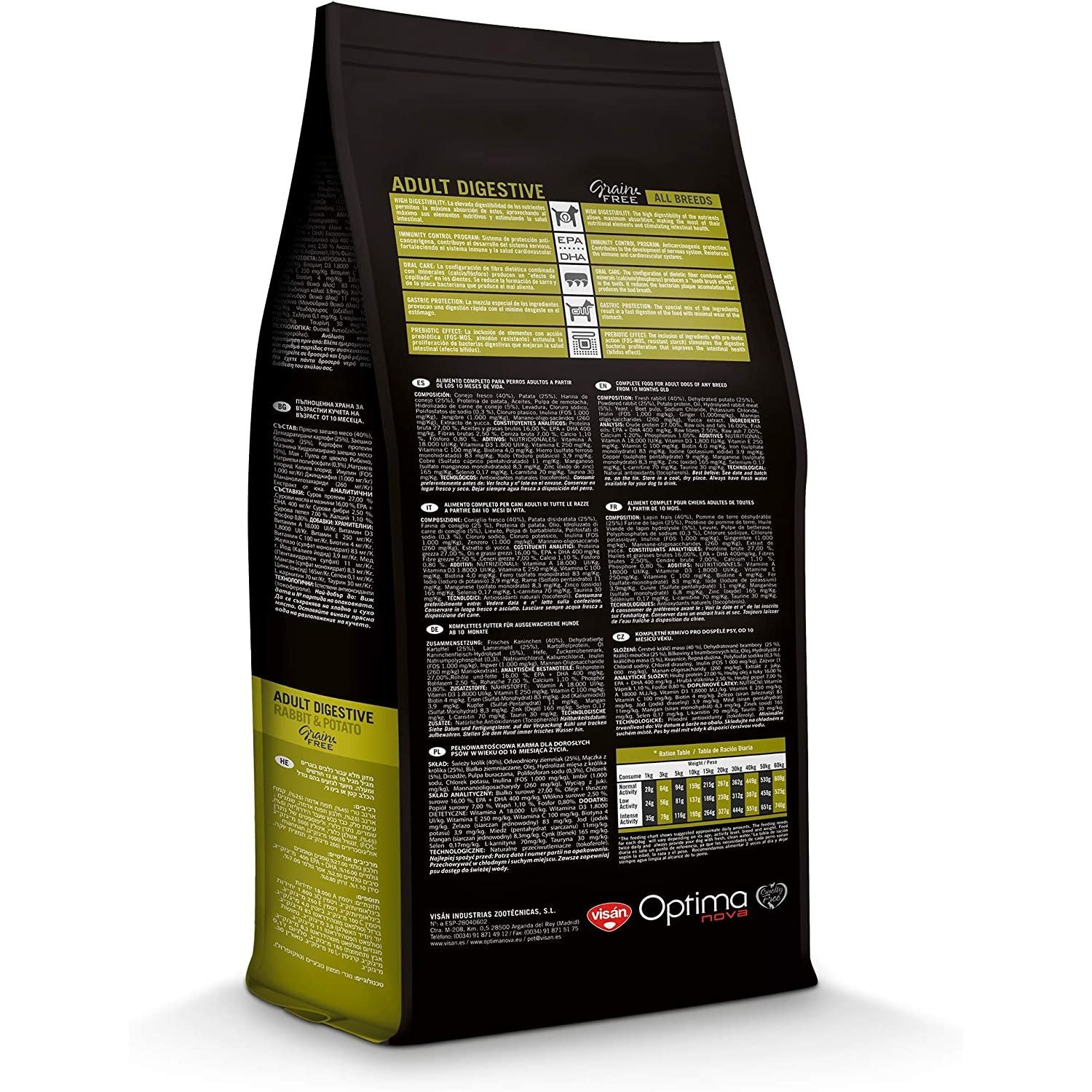 VISAN OPTIMA NOVA ADULT DIGESTIVE (conejo y patata), es un alimento completo SIN CEREALES para perros adultos de cualquier raza. *Este producto es ideal para perros con digestión delicada.HIGH DIGESTIBILITY: La elevada digestibilidad de los nutrientes permiten la máxima absorción de éstos, aprovechando al máximo sus elementos nutritivos y estimulando la salud intestinal.IMMUNITY CONTROL PROGRAM: Sistema de protección anti-cancerígena, contribuye al desarrollo del sistema nervioso, fortaleciendo el sistema inmune y la salud cardiovascular.ORAL CARE: La configuración de fibra dietéTica combinada con minerales (calcio/fósforo) producen un “efecto de cepillado” en los dientes. Se reduce la formación de sarro y de la placa bacteriana que produce el mal aliento.GASTRIC PROTECTION: La mezcla especial de los ingredientes provocan una digestión rápida con el mínimo desgaste en el estómago.PREBIOTIC EFFECT: La inclusión de elementos con acción prebiótica (FOSMOS, almidón resistente) estimula la proliferación de bacterias digestivas que mejoran la salud intestinal (efecto bífidus).COMPOSICIÓN: Conejo fresco (40%), Harina de conejo (25%), Patata deshidratada (20%), Proteína de patata, Aceites, Pulpa de remolacha, Hidrolizado de carne de conejo (5%), Levadura, Cloruro sódico, Polifosfatos de sodio (0,3%), Cloruro potásico, Inulina (FOS 1.000 mg/Kg), Jengibre (1.000 mg/Kg), Manano-oligo-sacáridos (260 mg/Kg), Extracto de yucca.CONSTITUYENTES ANALÍTICOS: Proteína bruta 27,00 %, Aceites y grasas brutos 16,00 %, EPA + DHA 400 mg/kg, Fibras brutas 2,50 %, Ceniza bruta 7,00 %, Calcio 1,10 %, Fósforo 0,80 %. ADITIVOS: NUTRICIONALES: Vitamina A 18.000 UI/Kg. Vitamina D3 1.800 UI/Kg. Vitamina E 250 mg/Kg. Vitamina C 100 mg/Kg. Biotina 4,0 mg/Kg. Hierro (sulfato ferrosomonohidratado) 83 mg/Kg. Yodo (Yoduro potásico) 3,9 mg/Kg. Cobre (Sulfato cúprico pentahidratado) 11 mg/Kg. Manganeso (sulfato manganoso monohidratado) 8,3 mg/Kg. Zinc (óxido de zinc) 165 mg/Kg, Selenio 0,17 mg/Kg, L-carnitina 70 mg/Kg. Taurina 30 mg/Kg. TECNOLÓGICOS: Antioxidantes naturales (tocoferoles).Disponible en envases de 800 gr, 2 kg y 12 kg.