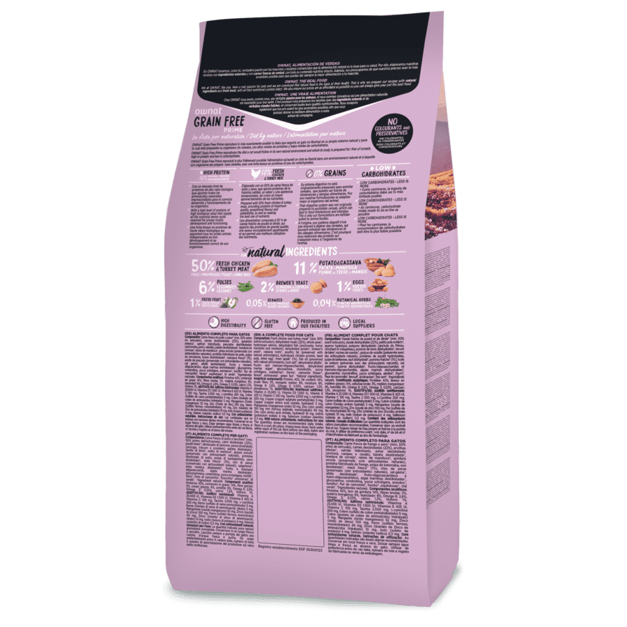 0% cereales: el sistema digestivo de los gatos no está originariamente preparado para asimilar cereales, que pueden ser fuente de intolerancias y alergias alimentarias.