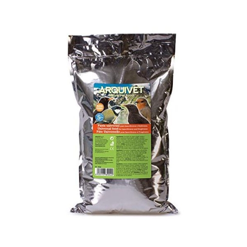 Arquivet Pasta Universal Insectívoros/Frugívoros esta es una pasta universal para todas y cada una de las aves que son insectívoras y frugívoras.La fórmula contiene bayas desmenuzadas, asimismo tiene semillas, insectos secos y gambas, todo mezclado.Aporta al organismo todas y cada una de las proteínas de alta digestibilidad, vitaminas, minerales y oligoelementos, precisos para el buen desarrollo del ave. VENTAJAS:Alimento completo y equilibrado.Aporta los elementos necesarios para el buen mantenimiento.Una mezcla de ingredientes de alta calidad. USOS Y ESPECIFICACIONES:Envase de 1kg y 5kg de pasta para alimentar a las aves que son frugívoras e insectívoras de todo tipo.