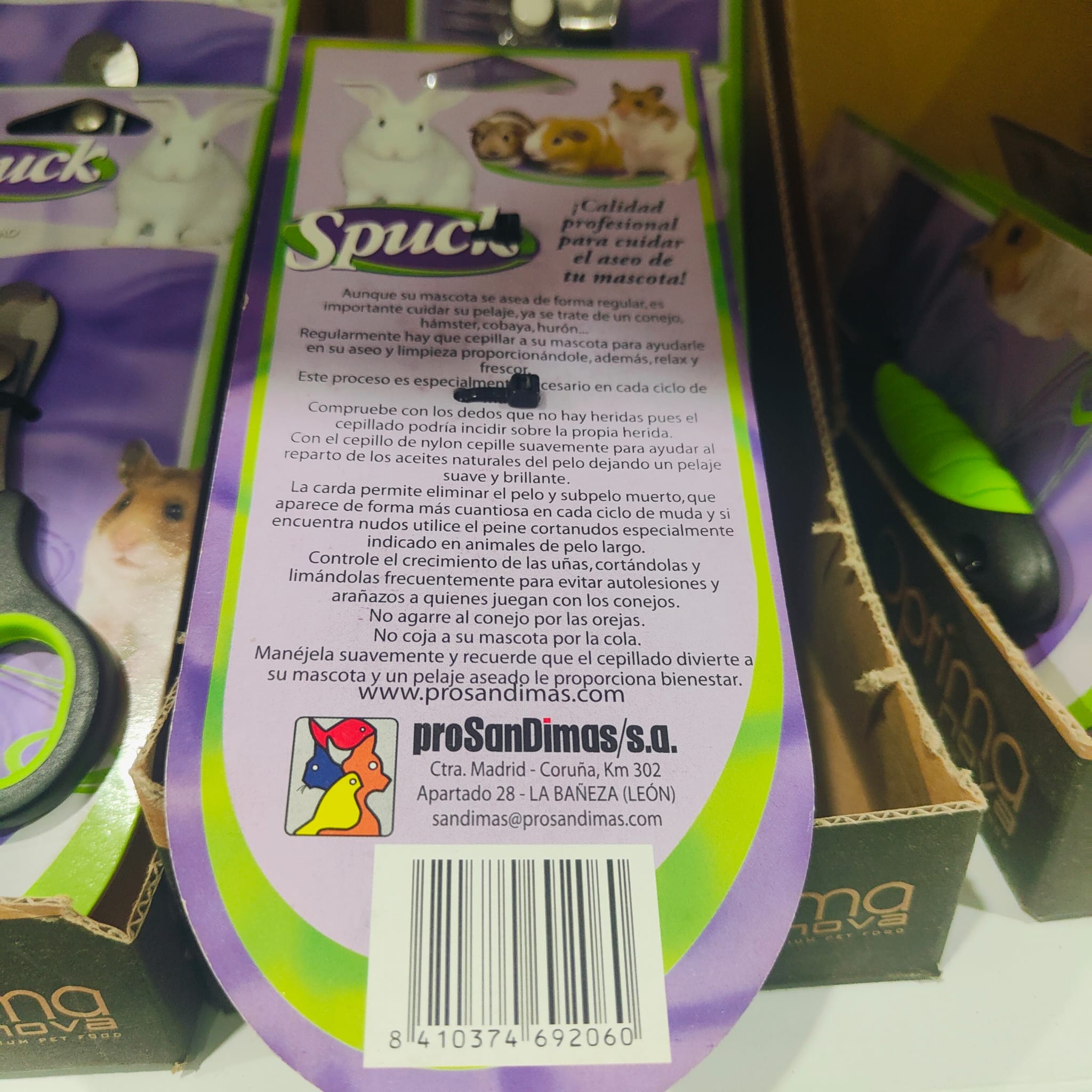 Calidad profesional para cuidar el aseo de su mascota.Aunque su mascota se asea de forma regular, es importante cuidar se pelaje, ya se trate de un conejo, hámster, cobaya, hurón…Regularmente hay que cepillar a su mascota para ayudarle en su aseo y limpieza proporcionándole, además, relax y frescor.Este proceso es especialmente necesario en cada ciclo de muda.Compruebe con los dedos que no hay heridas pues el cepillado podría incidir sobre la propia herida.Con el cepillo de nylon cepille suavemente para ayudar al reparto de los aceites naturales del pelo dejando un pelaje suave y brillante.La carda permite eliminar el pelo y subpelo muerto, que aparece de forma mas cuantiosa en cada ciclo de muda y si encuentra nudos utilice el peine cortanudos especialmente indicado en animales de pelo largo.Controle el crecimiento de las uñas, cortándolas y lijándolas frecuentemente para evitar autolesiones y arañazos a quienes juegan con los conejos.No agarre al conejo por las orejas.No coja a su mascota por la cola.Manéjala suavemente y recuerde que el cepillado divierte a su mascota y un pelaje aseado le proporciona bienestar.