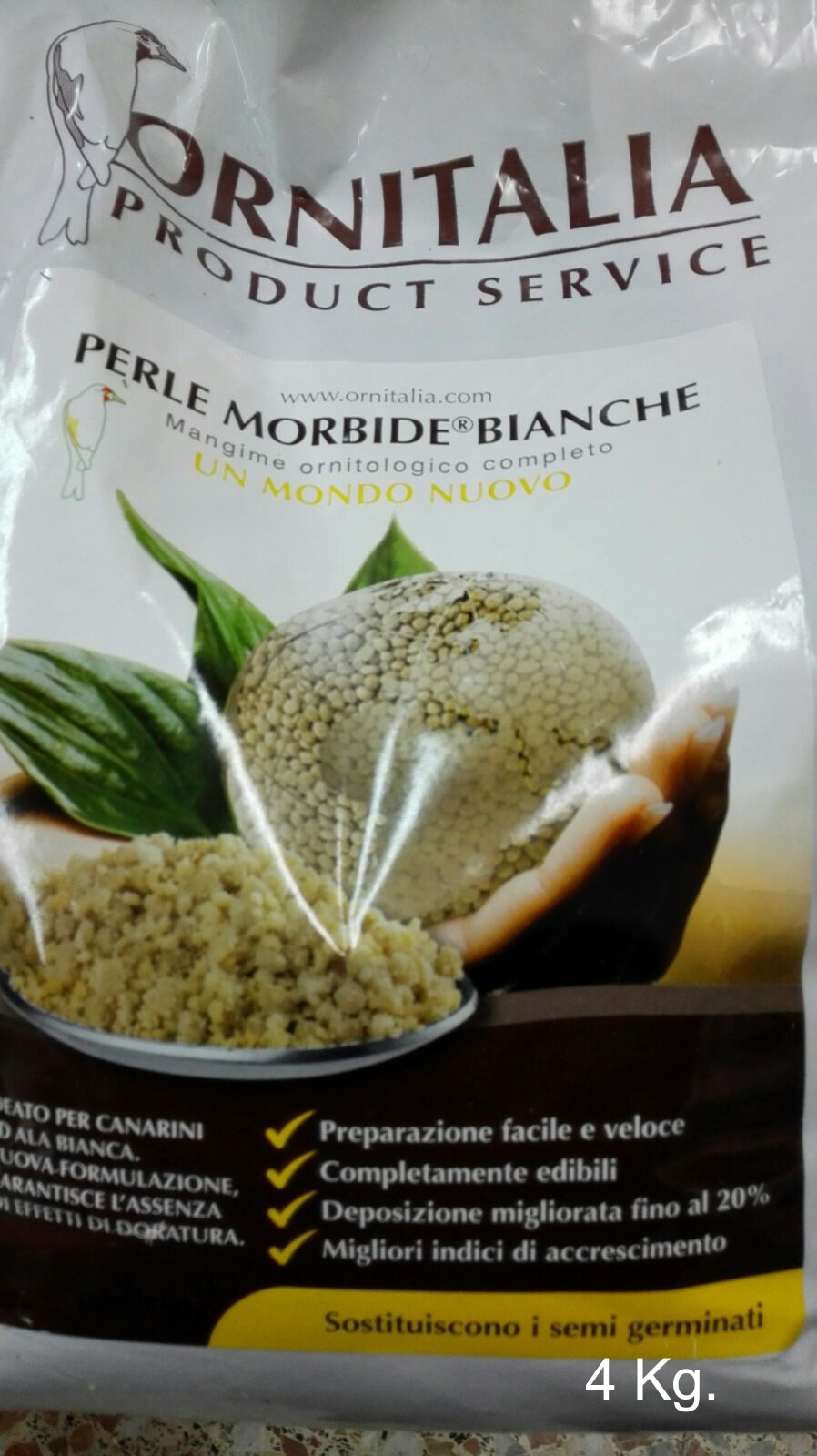 Perle Morbide Bianche 4kg, sustituto del germinado, especialmente indicado para canarios de alas blancas.Descripción: Sustituto del germinado, especialmente indicado para canarios de alas blancas como rojo mosaicos, amarillo mosaico…., intensifica el ala blanca.Composición: Cereales, proteínas vegetales, aceites vegetales, sales minerales, vitaminas (A, B1, B2, B3, B5, B6, B9, B12, C, D3, E, H, Y), aminoácidos (Lisina, metionina) aromas.Análisis: Proteína 16%, grasas 10%, Fibra 3%, Humedad 10%, ceniza 5%, Vitamina A, D3 y EAlimento extrusionado para pajaros granivoros.Modo de empleo: 100 gr. de producto + 200 ml. de agua.dejar reposar 60 minutos.Añadir a la pasta de cria.DETALLESPerle Mórbide® es un alimento completo y extruido compuesto por harinas, aceites, proteinas vegetales…vitamina E, B12, K3, L-lisina, cálcio, magnesio, biotina, extracto de romero y muchos más ingredientes que hacen un producto muy completo y adecuado para la época de cría.Perle Morbide® sustituye COMPLETAMENTE la administración de las semillas germinadas para canarios, jilgueros, Luganos, Verdecillos, Verderones, Cabezitas Negras, Cardenalitos de Venezuela, Camachuelos, pinzones y Exóticos incluyendo estrildas y aves similares, evitando el conocido riesgo de la germinación.BENEFICIOS:• preparación rápida y fácil • Completamente comestible • La puesta de huevos mejorado en un 20% • Eliminación de la micosis y otras enfermedades de riesgo causados por el proceso de germinación • Disminución hasta la desaparición del pichones pequeños con el PUNTO NEGRO • Mejor índice de crecimiento • Posibilidad de añadir en el agua cualquier medicamento o aditivo solublePREPARACIÓN:• Tomar 100gr de producto Perle Morbide ®• Añadir 200gr de agua (siempre debe ser el doble de cantidad que de Perle Morbide ®)• Dejar remojar 2 horas (mínimo 1 hora )• Añadir pasta de cría seca hasta conseguir una mezcla esponjosa dejando ver el «granulado».NOTA: Considerar en el momento de añadir el agua, la aportación de aditivos en líguido o en polvo para una mejor asimilación por parte del animal.CONSEJOS DE USO Y ADMINISTRACIÓN: • Iniciar la administración alrededor de un mes antes del apareamiento y continuando hasta al menos terminar la muda. • Puede dar Perle Morbide® también durante el período de descanso, dos o tres veces a la semana. • La cantidad a administrar es «a voluntad», dependiendo siempre de la cantidad de pichones a alimentar.• Como se trata de un producto muy atractivo, se recomienda la administración de al menos 2 cucharadas colmadas por día, en dos etapas: en la mañana y en la tarde / noche. • Preparar el producto todos los días, preferiblemente la noche anterior.• Se recomienda utilizar un cuenco de cerámica.•Al macene en un lugar seco y fresco.VALORES NUTRICIONALES GARANTIZADOS:Proteína cruda (min) 16% Grasa bruta (min) 10% La fibra cruda (max) 3% Humedad (max) 10% Cenizas (max) 4% Vitamina A (Min) 17,500 UI / kg La vitamina D3 (min) 800 UI / kg Vitamina E (min) 200 UI / kg Cobre (min) 10 mg / kgINGREDIENTESMaíz, trigo molido, avena molida, gluten de harina de maíz, aceite de coco, aceite de soja, proteína de patata, Calcio Carbonato, fosfato dicálcico, L-lisina, colina Sabores naturales y artificiales, cloruro, DL Metionina , Vitamina E.Suplementos,calcio L- ascorbilo 2 – monofosfato (Vitamina C estabilizada), biotina , extracto de Yucca schidigera, óxido de zinc, óxido de manganeso, Niacinamida, Vitamina B12.Suplemento, extracto de romero, sulfato de cobre, calcio Yodado, betacaroteno, óxido de magnesio, vitamina A, Acetato, pantotenato de calcio, selenita de sodio, Ácido Fólico, Riboavina, clorhidrato de piridoxina, Mononitrato de tiamina, colorantes naturales y artificiales, Menadiona, complejo de bisolfato sódico (fuente de vitamina K3 ), suplemento de vitamina D3, Sulfato de Cobalto, Mixet tocoferoles .