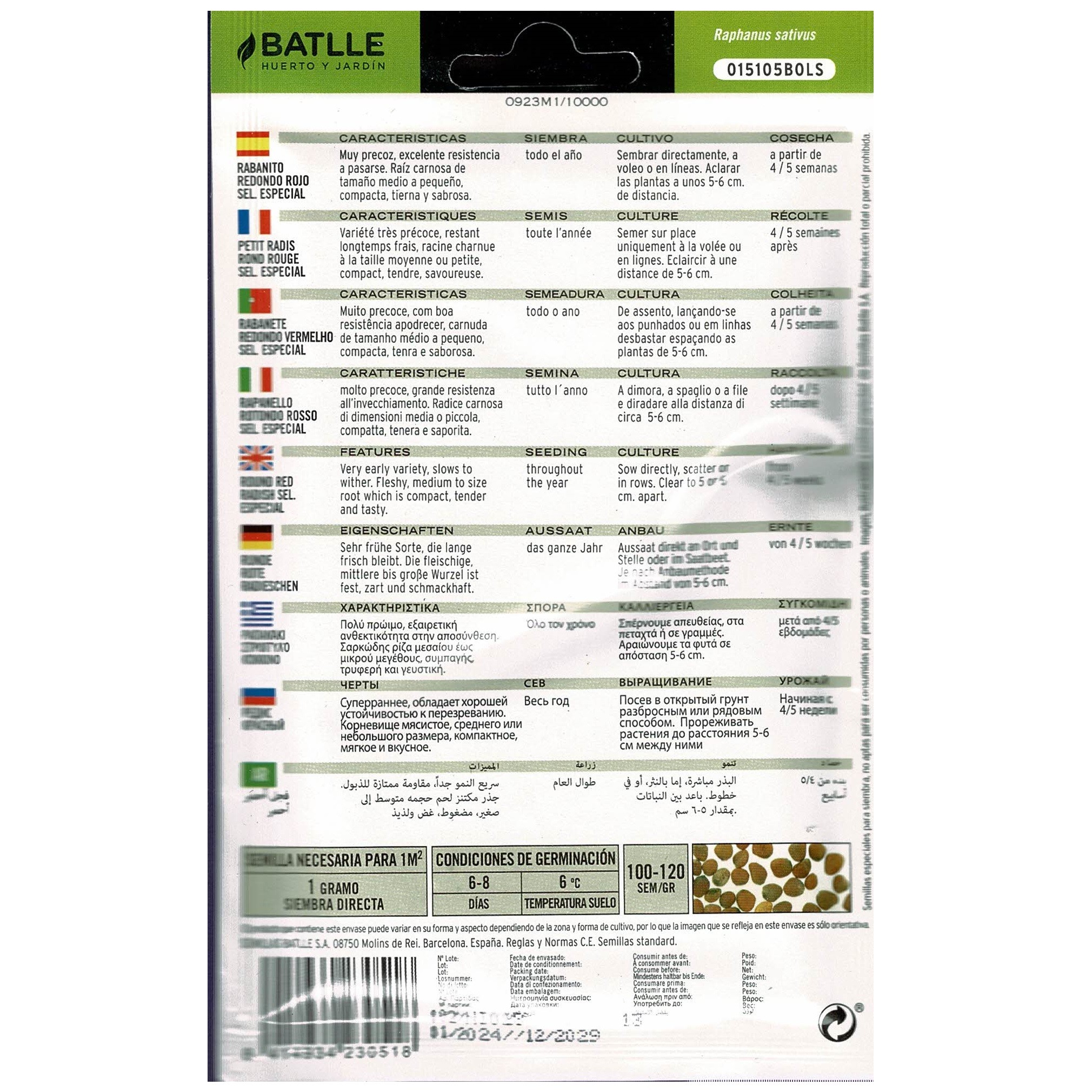 El rábano (Raphanus sativus), es una planta de la familia Crucíferas, que se cultiva por sus raíces comestibles. Es un cultivo muy fácil y rápido. Cada 30 días podemos tener rabanitos bien formados y listos para comer. Tiene diferentes formas (redondeado, mediolargo y largo) y coloraciones (blanco, rojo, rosa con punta blanca, etc.). Hay dos subespecies el sativus que es el rabanito y longipinnatus que es el rábano tipo japonés o daikon.. Muy apreciado en ensaladas por su colorido y sabor característico.CONSEJOS GENERALES PARA EL CULTIVO DE LOS RABANITOSAl ser una especie de crecimiento rápido y producir plantas de pequeño tamaño, la fase de la siembra es la más delicada.Utilizar una variedad adaptada a la época de siembra. Para las siembras de Otoño y Primavera, casi todas las variedades son aconsejables por ser la época de cultivo más fácil. Para las siembras de Invierno, variedades adecuadas para los días cortos y para siembras de Verano, variedades tardías y de raíz compacta.La textura de la parcela debe ser ligera o franca y de una buena fertilidad.Elegir un buen lugar de la parcela en función de la estación del año. En Invierno las siembras se harán bajo plástico o protegidas de alguna forma. En Primavera y Otoño se puede hacer en cualquier lugar, pero en Verano es recomendado sembrar en lugares sombreados y frescos.Sembrar semilla a semilla en líneas. Es más engorroso que la siembra a voleo pero se evita que la nascencia sea heterogénea con la pérdida de plantas al no formar la raíz correctamente, ya que el rabanito a pesar de su pequeño tamaño necesita una determinada superficie para su perfecto desarrollo.Enterrar las semillas a una profundidad correcta ya que influye sobre la forma posterior. Las variedades redondas superficialmente (0,5-1 cm. máximo) y las mediolargas a 2-3 cm.Regar frecuentemente, ya que al ser de crecimiento rápido necesita una humedad constante sin encharcamientos. Es muy adecuado el riego por aspersión. Si pasa periodos de sequía afecta al desarrollo y calidad de las raíces.Recolectar en el momento oportuno. Es más aconsejable recogerlos antes de su completo desarrollo que pasados, ya que la calidad se verá afectada.RABANITO REDONDO ROJO SEL. ESPECIALVariedad muy precoz, especial para mercado con excelente resistencia a pasarse. Raíz carnosa de tamaño medio a pequeño, compacta, tierna y sabrosa. Apta para cosechar todo el año. Forma de cultivo: Puede sembrarse todo el año, sólo de asiento, a voleo o en líneas de 25 cms. de separación. Repartir uniformemente la semilla. Aclarar a 5 ó 6 cms. de distancia. Recolección: aproximadamente a los 30 días de su siembra.